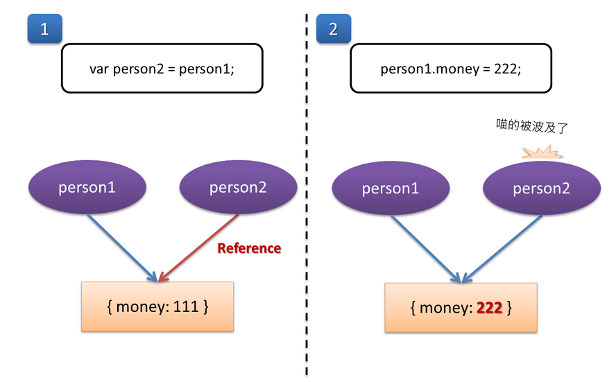 person1.money更換值的內容,連person2的屬性也一起變動到。