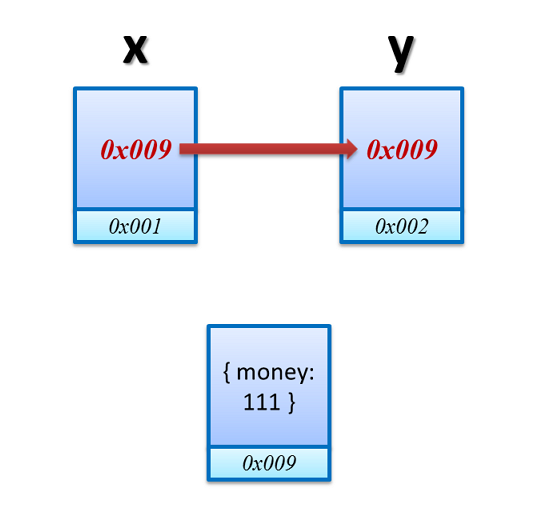 從底層實際運作的角度來看,不管是原生型別 (Primitive) 或物件型別 (Object),在作 x = y 這個動作時,都是把 x 內儲存的值複製一份到 y 裡 (不管這個值的內容是一個數值或一個位址)。