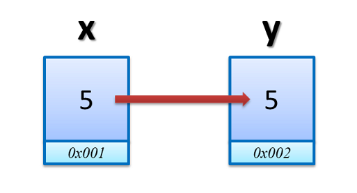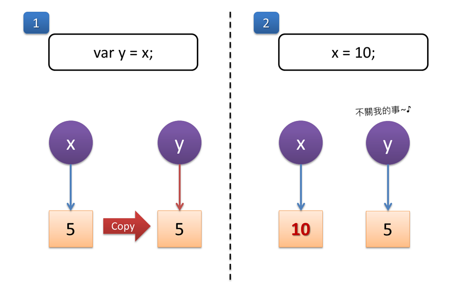 以上面的例子來說,就是將變數 y 指向一塊新的記憶體,然後將變數 x 裡的值複製一份放進去,等於變數 x 和 y 裡存放的是兩份獨立的資料,其中一份改變,不會影響另一份。