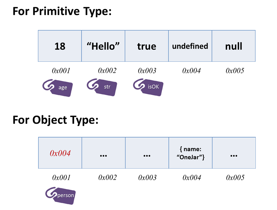 以 JavaScript 來說會有兩種: 1. 資料是原生型別 (Primitive) 時,變數在記憶體內儲存的是「資料的內容」,也就是我們常稱的 Pass by value。 2. 資料是物件型別 (Object) 時,變數在記憶體內儲存的是「資料的位址」,通過這個位址,可以找到實際儲存資料的地方,也就是我們常稱的 Pass by reference