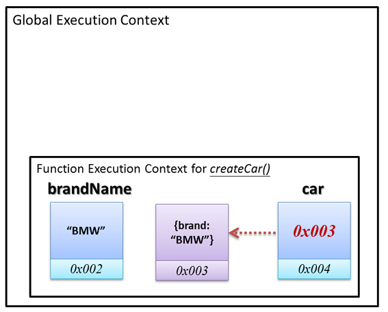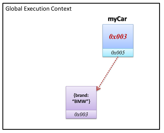 car負責儲存新物件,但因為新物件是物件型態 (Object Types),無法直接存放到car變數盒子裡,因此儲存的是位址0x003,建立引用關係。