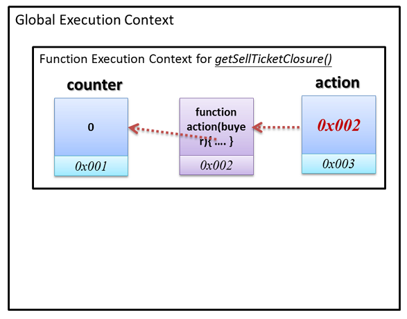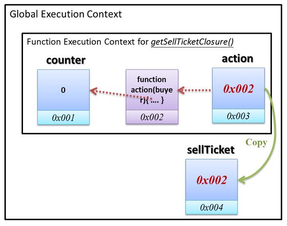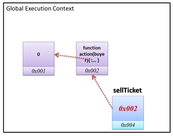 action()的函數物件回傳出去給 Global 環境,宣告一個sellTicket負責承接。sellTicket是一個函數物件,也是一個閉包。