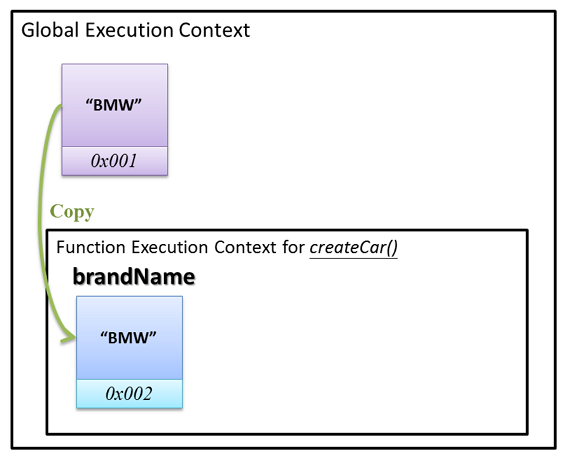 createCar()的同時,產生一個字串實字 (Object Literals)"BMW",暫時放在位址0x001的盒子,準備用來傳入參數。Local 環境自動宣告一個 Local 變數